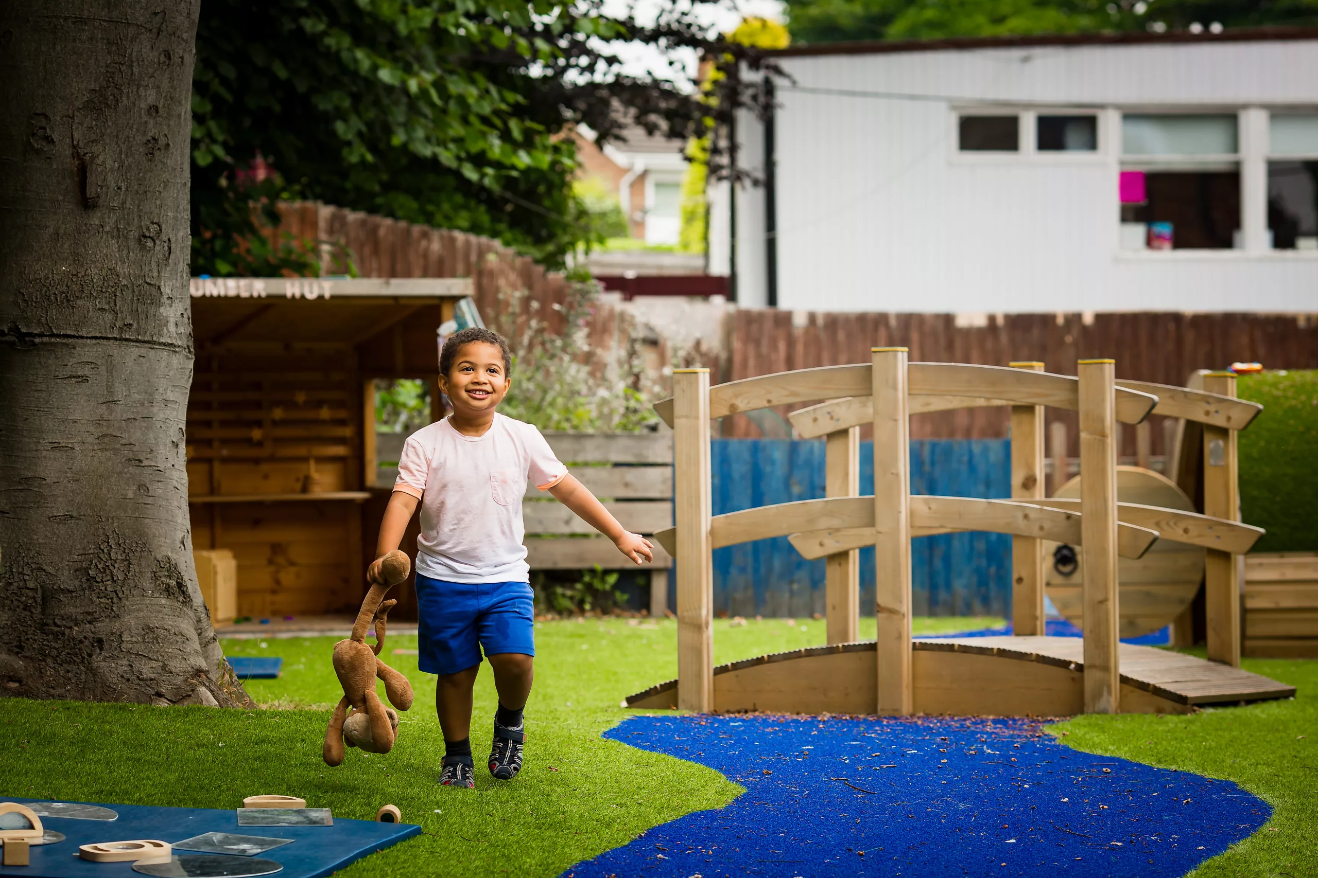 Joseph is walking in a garden, holding a teddy with one hand. He is wearing a pink t-shirt and blue shorts.
